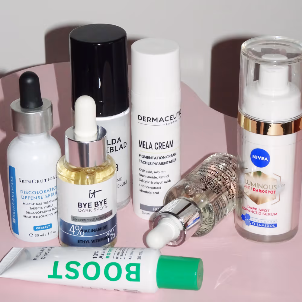 Produkter inriktade på att ljusa upp hyperpigmenteringar innehåller oftast ingredienser som kan hämma melaninproduktionen, skynda på cellförnyelsen eller skydda huden mot nya skador – eller jobba för en kombination av alla dessa effekter.
