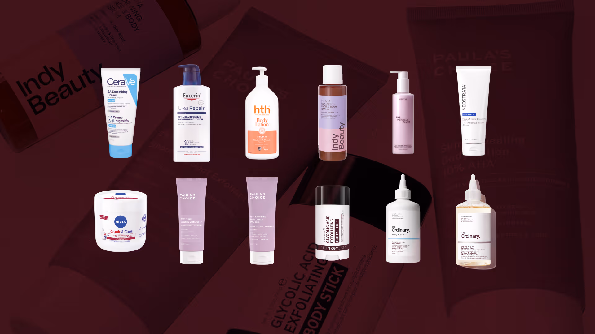 Alla testade produkter i vårt stora test av Keratosis Pilaris-behandling, uppställda mot en mörkröd bakgrund. Produkterna inkluderar bland annat CeraVe SA Smoothing Cream, Eucerin Urea Repair, hth Body Lotion, Indy Beauty AHA Face & Body Serum, Mantle The Miracle Fluid, Nivea Repair & Care, Paula’s Choice Skin Revealing Body Lotion 10% AHA, Paula’s Choice Smoothing Spot Exfoliant, The Inkey List Glycolic Acid Exfoliating Body Stick samt två produkter från The Ordinary: Body Care och Glycolic Acid 7% Toning Solution.